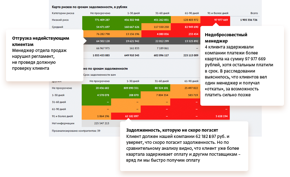 Просрочка формирует негативную платежную историю, ухудшает репутацию плательщика. СПАРК предоставляет эту информацию непосредственно лицам, принимающим решения о заключении договоров, выдаче кредитов, предоставлении отсрочки платежа, определении условий работы с клиентами.